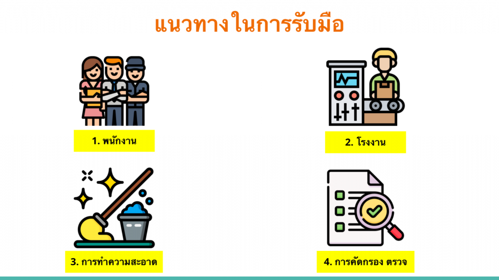 - เพิ่มมาตรการป้องกันโรค (Social Distance, ใส่ Mask, ล้างมือ)