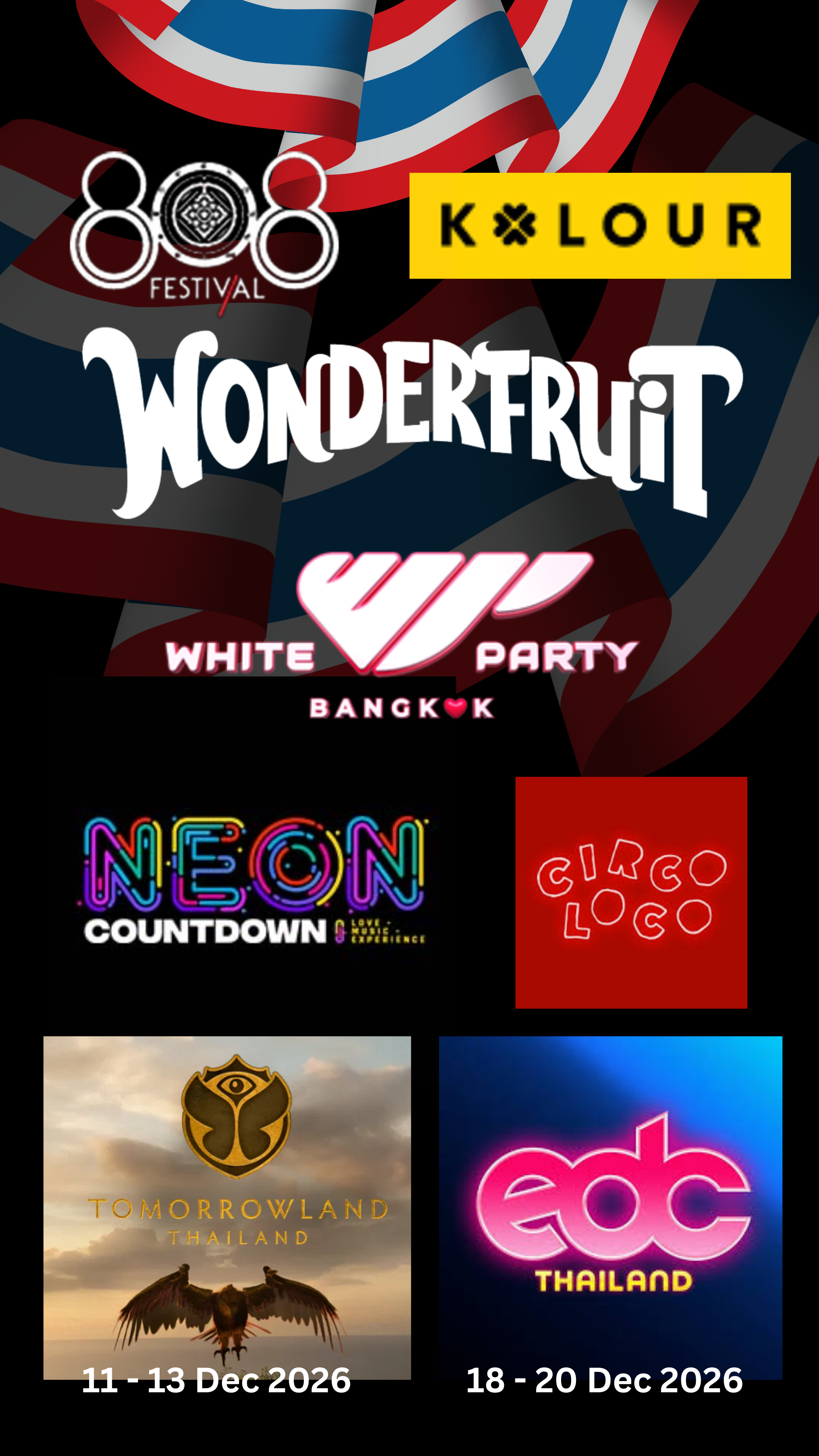 - 808, Kolor wonderfruit, white party, and it worth mentioned that these 4 events are THAI MADE one, so if u want to support the local, feel free to check these